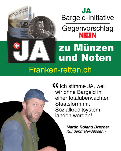 Nur mit der Volksinitiative schreiben wir das Bargeld als Münzen und Noten in die Bundesverfassung – wo es zur Erhaltung auch hingehört. Der trügerische Gegenvorschlag lässt weiterhin die Hintertür für die Abschaffung des Schweizer Bargeldes als Münzen und Noten offen. Stimmen Sie JA zur Initiative und NEIN zum Gegenvorschlag!